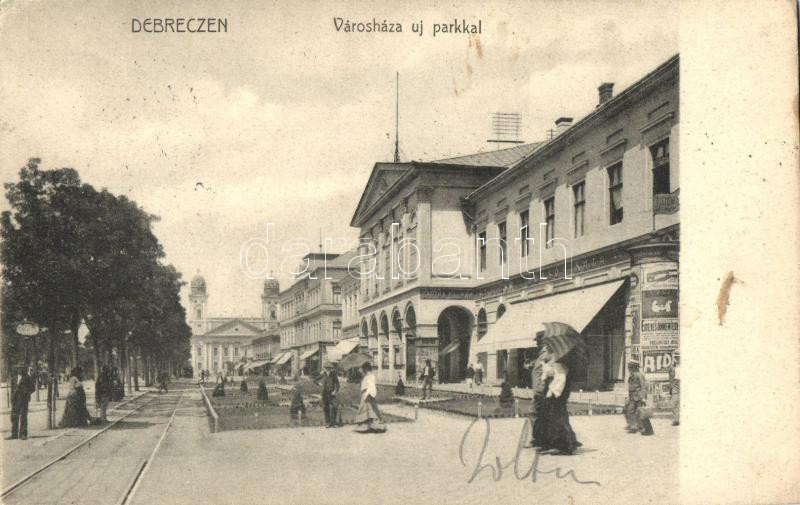 Leírás: Debrecen, Városháza, új park, Borsos Kata és Bartha Kálmán üzlete (EK)