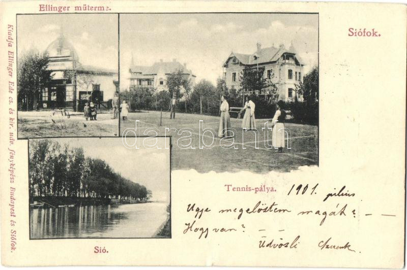 Siófok, Ellinger műterme, teniszpálya; kiadja Ellinger Ede https://www.darabanth.com/hu/215-Gyorsarveres/215.0/Kepeslapok/Magyarorszag~40010/Siofok-Ellinger-muterme-teniszpalya-kiadja-Ellinger-Ede~II906502