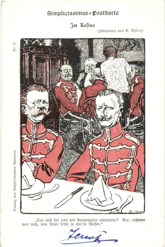 Im Kasino; Simplicissimus-Karte No. 17. s: E. Thöny https://www.darabanth.com/hu/215-Gyorsarveres/215.0/Kepeslapok/Muvesz~40074/Im-Kasino-Simplicissimus-Karte-No-17-s-E-Thony~II907823