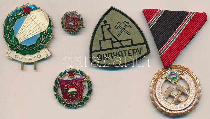 Leírás: DN "Bányászati Szolgálati Érdemérem arany fokozata" aranyozott, zománcozott kitüntetés mellszalaggal + "Bányaterv" jelvény + Ejtőernyős oktatói zománcozott jelvény + 2db "Szocialista Brigád" zománcozott jelvény T:2,1-