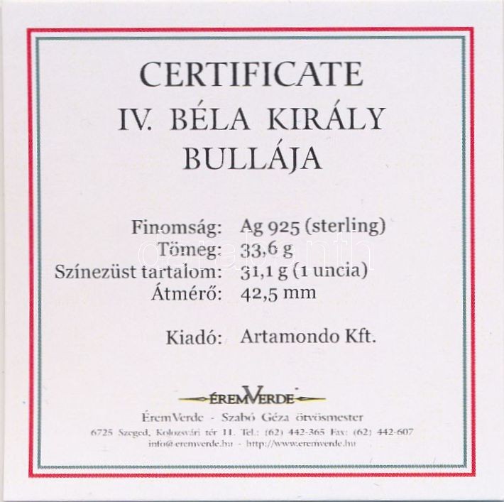 Leírás: Szabó Géza (1939-) DN "IV. Béla Király Bullája" Ag emlékérem dísztokban, tanúsítvánnyal (33.6g/0.925/42,5mm) T:BU