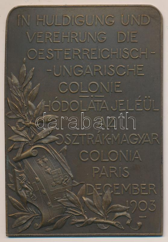 Szirmai Tony (Antal) (1871-1938) 1903. "Hódolata jeléül az Osztrák-Magyar Colonia Paris" szignó nélküli Br plakett, hátlapján forrasztásnyom (80x55mm) T:2