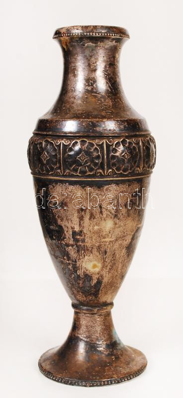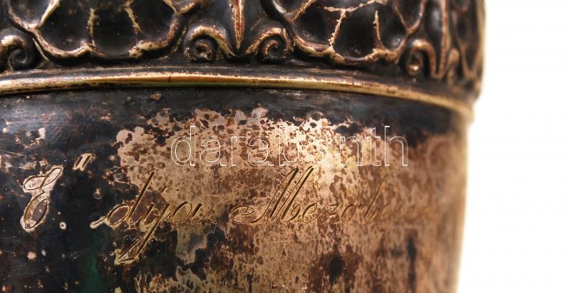 Leírás: Ezüstözött alpakka váza, "DBGH díja Mezőberény 1926" felirattal, horpadt, üveg betéttel, m:32 cm