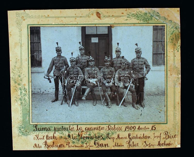 Leírás: 1909 Az első járőrcsapat a szerb határnál, kartonra kasírozva, feliratozva, 16x12 cm