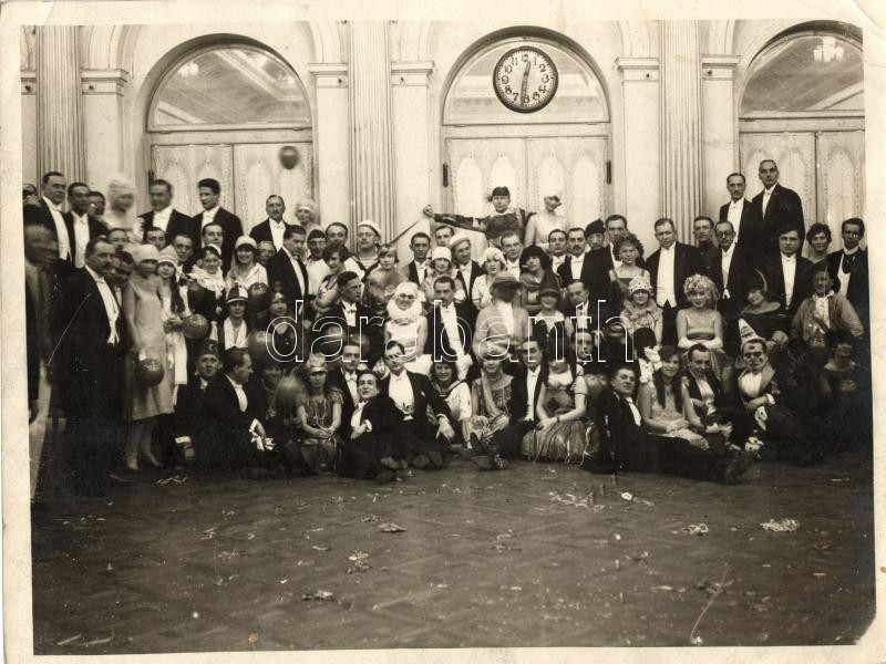 Leírás: 1926 március - Társasági élet Budapesten, a Magyar Atlétika Club álarcos báljának éjszakáján készült csoportkép a bálozókról, 18x24 cm