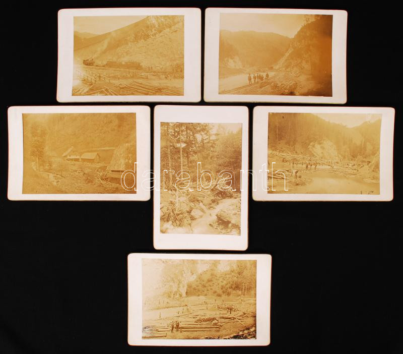 cca 1890 Fakitermelés a Tátrában. Kisvasúti vonal és szerelvények. 6 db nagyméretű keményhátú fotó / cca 1890 Lumber works in the Tatra and railway. 6 Large photos. 22x15 cm