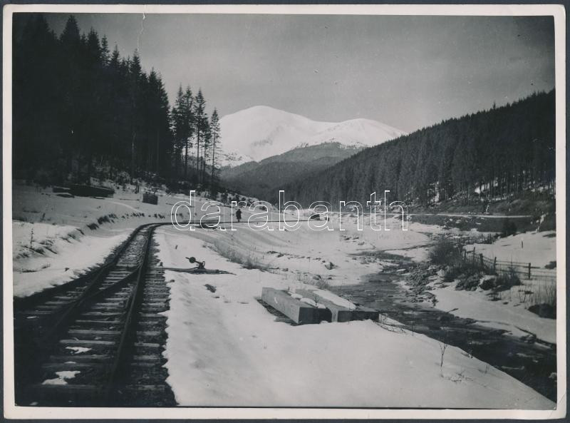 cca 1950 Ukrajna, Kárpátalja, a Kozmescseki iparvasút, háttérben a Hoverla, azaz Hóvár, Ukrajna legmagasabb csúcsa, feliratozva, képszéli szakadások, 18x24 cm