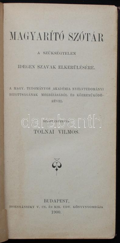 Tolnai Vilmos(szerk.): Magyarító szótár, A szükségtelen idegen szavak elkerülésére. Bp., 1900, Hornyánszky V.Cs. és Kir.Udv. Könyvnyomdája. Kiadói aranyozott egészvászon kötés, gerincnél kopott, belül a gerincnél kissé levált, kopottas állapotban.