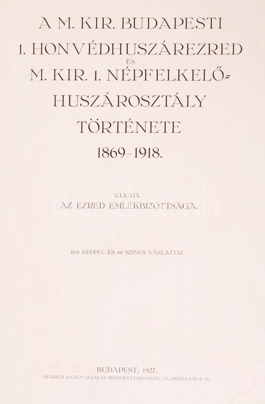 A M. Kir. Budapesti 1. Honvédhuszárezred és M. Kir. 1. Népfelkelő Huszárosztály története 1869-1918. Kiadja: Az ezred emlékbizottsága. 678 képpel és 68 színes vázlattal. Bp., 1927, Stádium Sajtóvállalat. Kiadói aranyozott, festett egészvászon kötés, gerincnél szakadt, képekkel illusztrált, 251-256-ig és 519-562-ig fénymásolt lapokkal pótolt, viseltes állapotban.