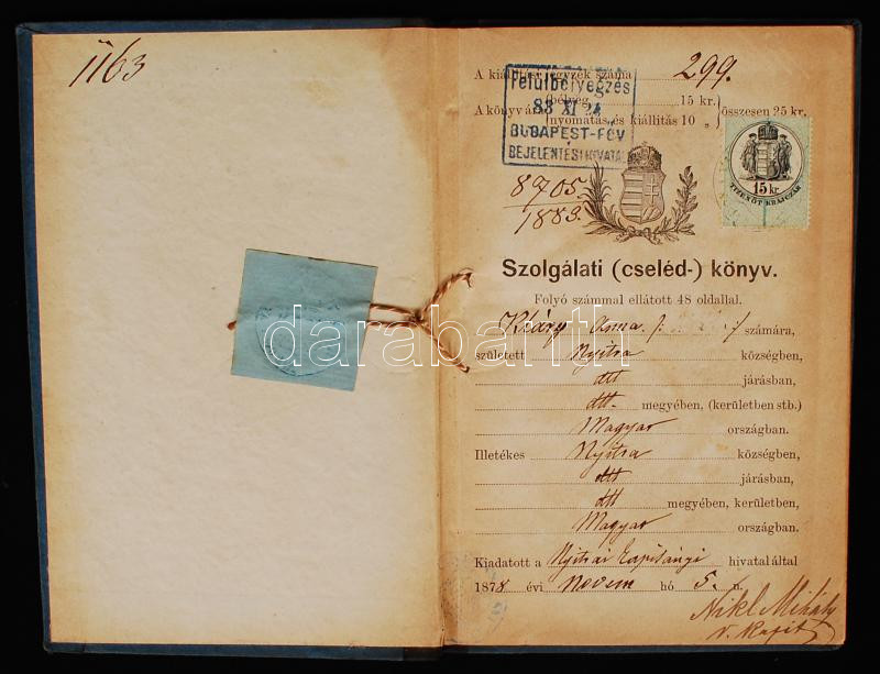 1883 Szolgálati (cseléd) könyv https://www.darabanth.com/hu/216-Gyorsarveres/216.0/Festmeny-mutargy-papirregiseg-egyeb/Okmanyok~400053/1883-Szolgalati-cseled-konyv~II916828