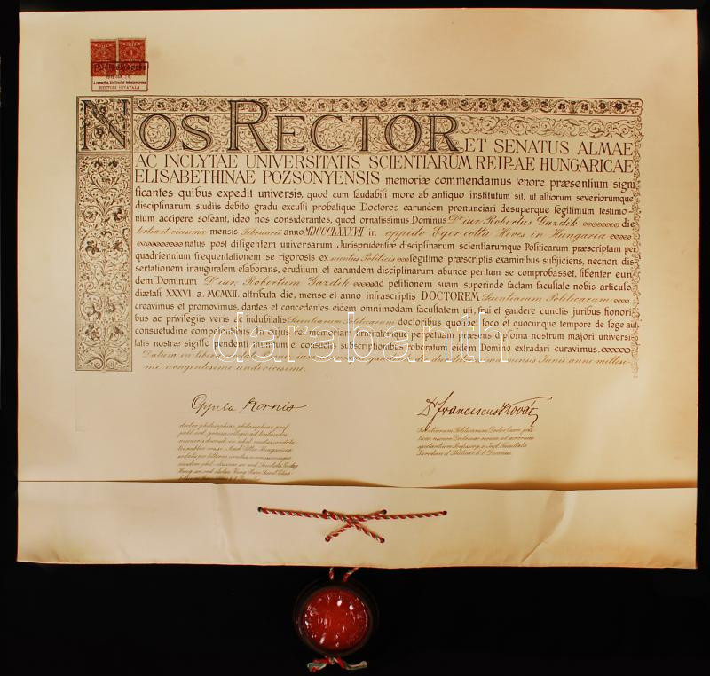 1912 Államtudományi diploma. A pozsonyi Erzsébet Tudományegyetemről. Függőpecséttel. Tokkal. Szép állapotban / Diploma for lawyer from the Pressburg University 40x70 cm