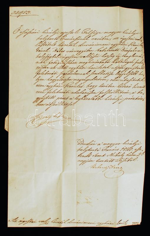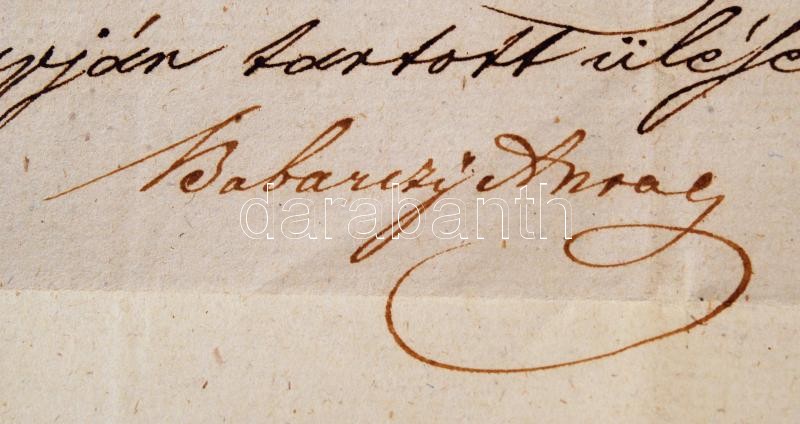 1843 Helytartótanácsi leirat a bánfalvi égostai templom felépítésének ügyében Szőgyény-Marich László (1806–1893) jogász, császári és királyi kamarás, MTA tagja és báró Babarczy Antal (1818-1881) saját kezű aláírásával. Papírfelzetes viaszpecséttel