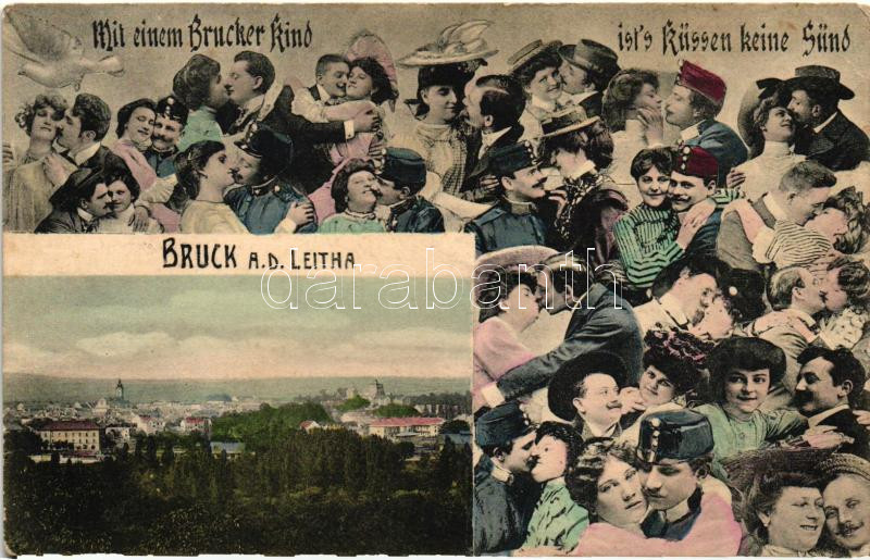 Leírás: Lajtabruck, Bruck and der Leitha, kissing couples, soldiers; collage (EK)
