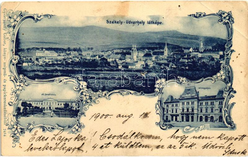 Leírás: Székelyudvarhely, vármegyeháza, állami főreáliskola, kiadja Gyertyánffy Gábor / county hall, school Art Nouveau (lyuk, pinhole)