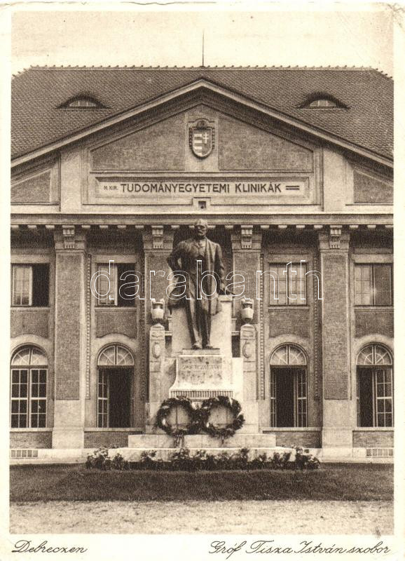 Debrecen, Tudományegyetemi klinikák, Gróf Tisza István szobra (fa) https://www.darabanth.com/hu/216-Gyorsarveres/216.0/Kepeslapok/Magyarorszag~400016/Debrecen-Tudomanyegyetemi-klinikak-Grof-Tisza-Istvan-szobra-fa~II914725