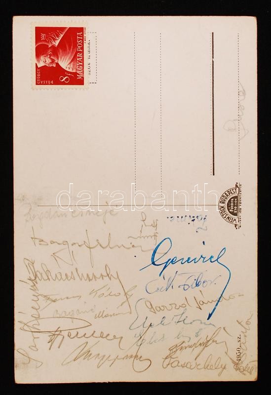 1948 A londoni nyári olimpiai játékokon résztvevő magyar olimpiai bajnokok aláírásai képeslapon (Csík Tibor, Elek Ilona, Takács Károly, Vásárhelyi Edit, Ferencz Károly, Gerevich Aladár stb.)