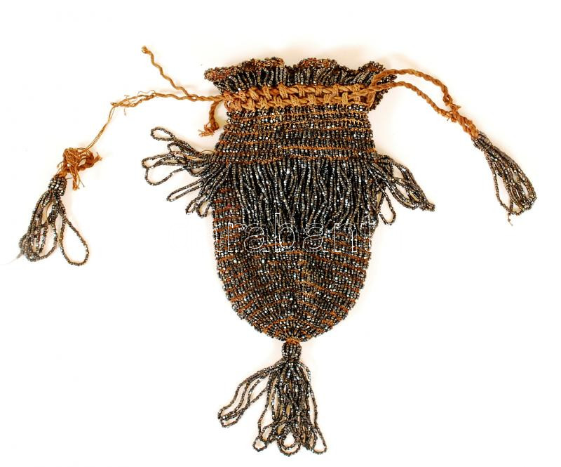 Leírás: Régi díszes szütyő, kisebb szakadásokkal, h:40 cm