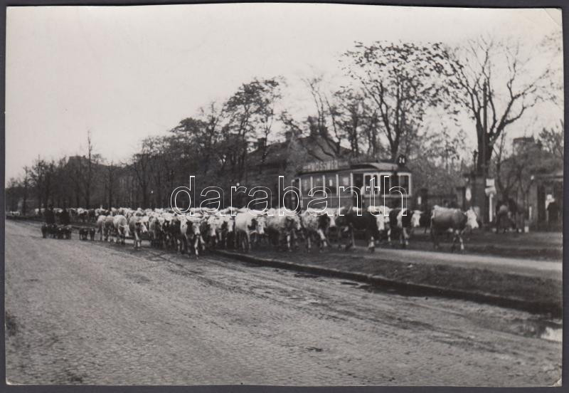 1945. május, Tiszavölgyi József: Budapest éhező lakossága lábon kaja az élelmiszer utánpótlást, a háttérben a 24-es villamos, pecséttel jelzett vintage fotó, 11x17 cm