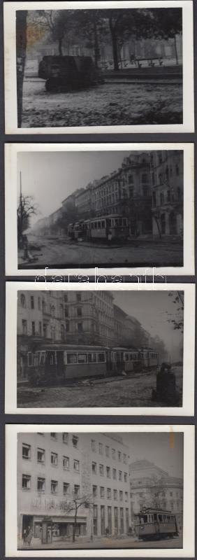 Leírás: 1956 Bp., Utcaképek a forradalomból (kilőtt villamosok, harckocsi), 4 db fotó, 9x6 cm