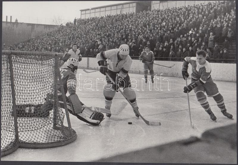 Leírás: 1967 Jégkorong mérkőzés Budapesten, ahol az Újpesti Dózsa győzött 5:3-ra az FTC csapatával szemben, jelzetlen sportfotó, 15x22 cm