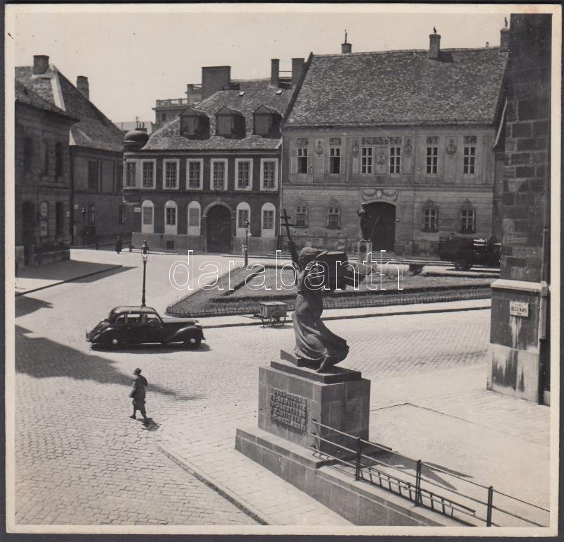 cca 1937 Darányi Erzsébet: Budapest, Budai vár, Bécsi kapu tér a rohanó angyal szoborral és egy kevésbé rohanó régi autóval, aláírt vintage fotó, 13x13 cm