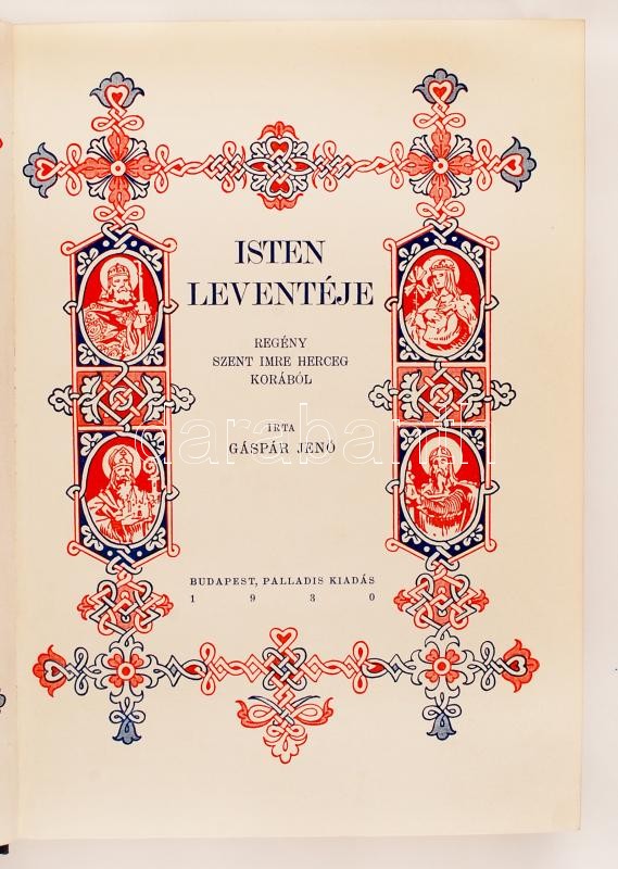 Gáspár Jenő: Isten leventéje. Regény Szent Imre herceg korából. Bp., 1930, Palladis. Kiadói festett egészvászon kötés, néhány lapja kijár, egyébként jó állapotban.