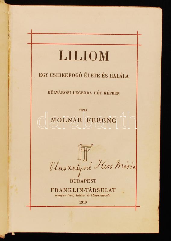 Molnár Ferenc: Liliom, Egy csirkefogó élete és halála, külvárosi legenda két képben. Bp., 1910, Franklin-Társulat. Első kiadás. Kiadói dombornyomott egészvászon kötés, festett lapszélek, jó állapotban.