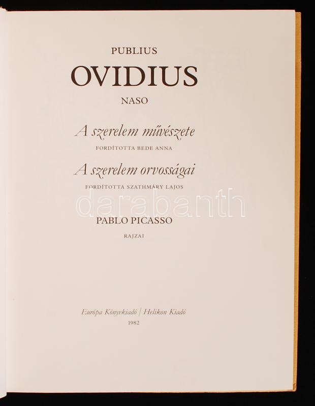 Ovidius Naso, Publius: A szerelem művészete; A szerelem orvosságai. Pablo Picasso rajzaival. Bp., Európa - Helikon, 1982. Papírkötésben, jó állapotban.