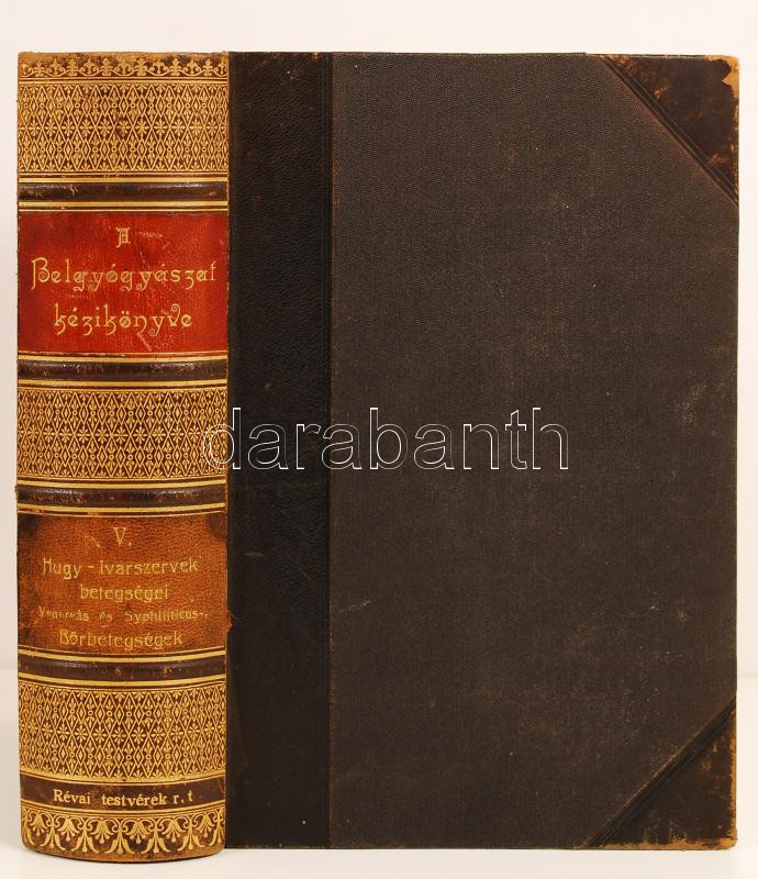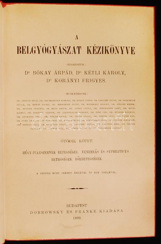 Leírás: Bókay Árpád, Kéthli Károly, Korányi Frigyes (szerk.): A belgyógyászat kézikönyve V.: Húgy-ivarszervek betegségei, venereás és syphiliticus betegségek, bőrbetegségek. Bp., 1899, Dobrowsky és Franke. Aranyozot gerinccel, félbőr kötésben, Ladányi Ármin orvos possessori bélyegzőjével, jó állapotban.