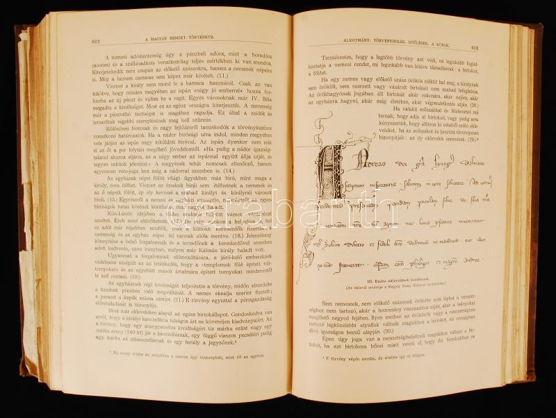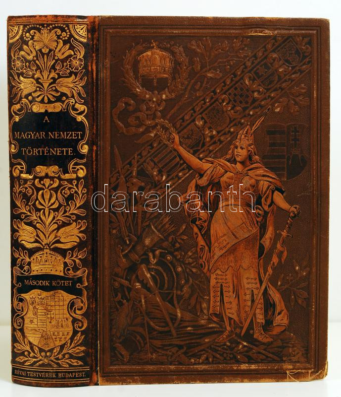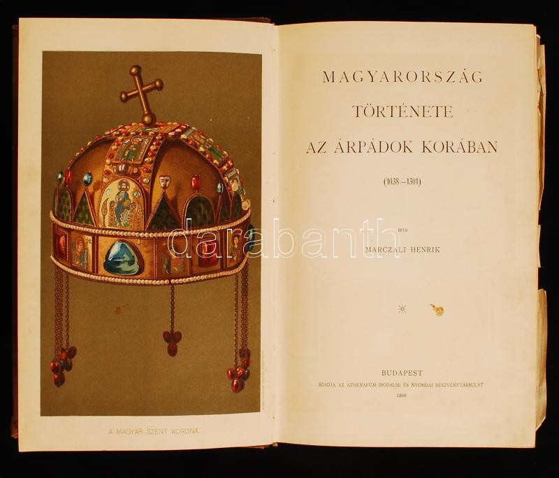 A magyar nemzet története II.: Marczali Henrik: Magyarország története az Árpádok korában (1038-1301). Bp., 1896, Athenaeum. A belső kötéstáblán possessori bejegyzéssel. Képekkel illusztrált félvászon kötés, szakadozott szélű mellékletekkel, a gerince aranyozott, jó állapotban.