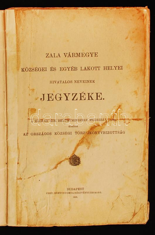 1909 Bp., Zala vármegye községei és egyéb lakott helyei hivatalos neve... https://www.darabanth.com/hu/217-Gyorsarveres/217.0/Festmeny-mutargy-papirregiseg-egyeb/Nyomtatvanyok~12/1909-Bp-Zala-varmegye-kozsegei-es-egyeb-lakott-helyei-hivatalos-neveinek-jegyzeke-40p~II920708