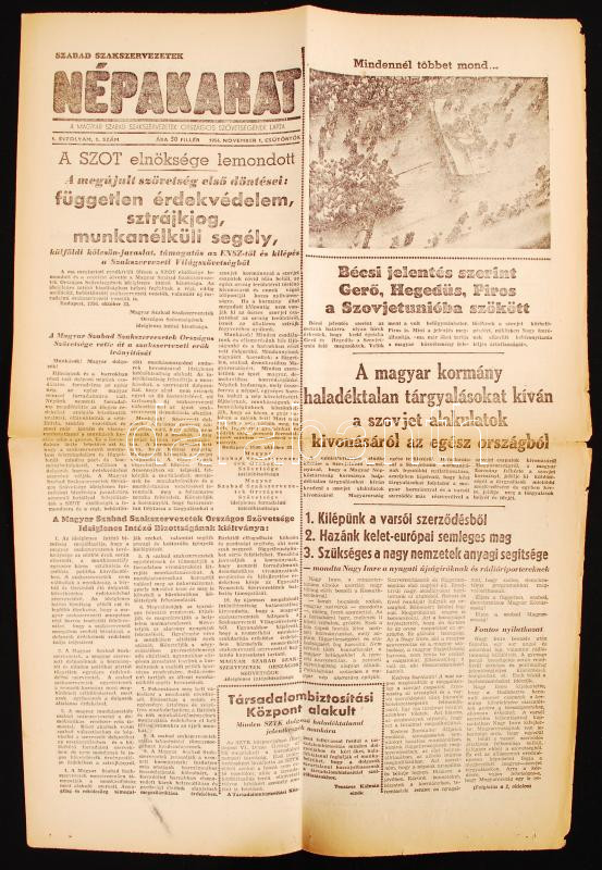 Leírás: 1956. A Népakarat, a Magyar Szabad Szakszervezetek Országos Szövetségének lapja november 1-i száma (I. évf. 1. szám) forradalmi hírekkel.