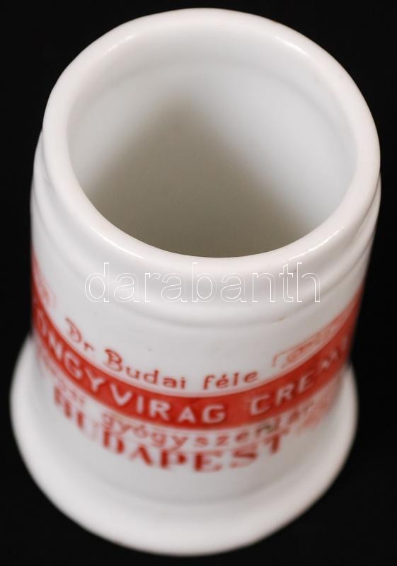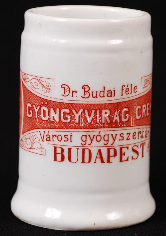 Leírás: Dr. Budai féle Gyöngyvirág créme Városi Gyógyszertár Budapest feliratú porcelán gyógyszeres tégely, m: 6,5, d: 4 cm