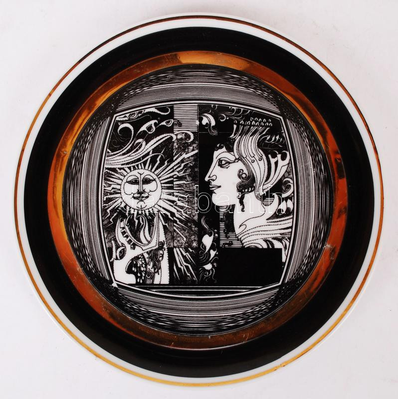 Leírás: Hollóházi Szász Endre által tervezett fali tál, matricás, jelzett, karcolásokkal, d:15 cm