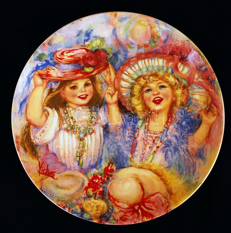Leírás: Wedgwood kalapos kislányokat ábrázoló számozott színes porcelán dísztál, hibátlan, jelzett, d: 20 cm