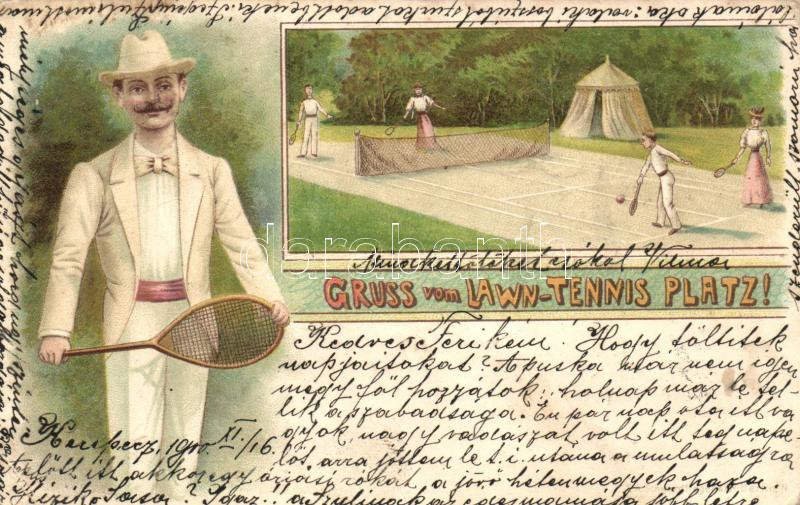 Leírás: Gruss vom Lawn-Tennis Platz / lawn tennis court, litho (wet damage)