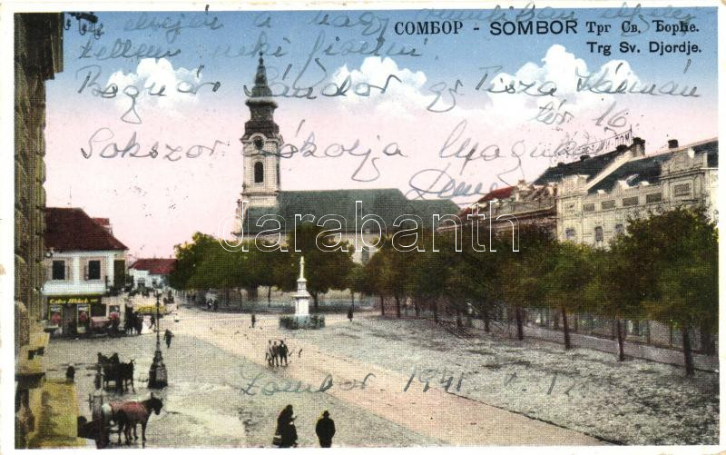 Zombor, Sombor; Trg Sv. Djordje / sguare, church, shop, vissza So. Stp... https://www.darabanth.com/hu/217-Gyorsarveres/217.0/Kepeslapok/Vajdasag~600010/Zombor-Sombor-Trg-Sv-Djordje-sguare-church-shop-vissza-So-Stpl-EK~II921642