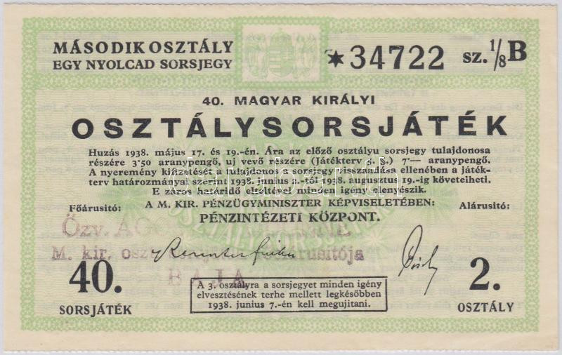 1938. "40. Magyar Királyi Osztálysorsjáték" 2. osztály 1/8 sorsjegye T... https://www.darabanth.com/hu/217-Gyorsarveres/217.0/Numizmatika/Reszvenyek-es-sorsjegyek~400004/1938-40-Magyar-Kiralyi-Osztalysorsjatek-2-osztaly-18-sorsjegye-TI-~II924793