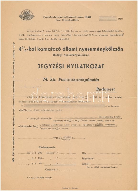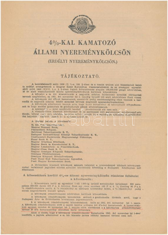 Leírás: Budapest 1941. "4%-kal kamatozó állami nyereménykölcsön" (erdélyi nyereménykölcsön) tájékoztató és jegyzési nyilatkozat T:II,III