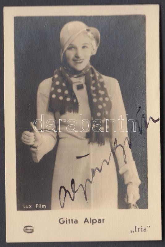1934 Alpár Gitta (1903-1991) színésznő, opera-énekesnő aláírása az őt ... https://www.darabanth.com/hu/218-Gyorsarveres/218.0/Festmeny-mutargy-papirregiseg-egyeb/Alairas~200029/1934-Alpar-Gitta-1903-1991-szineszno-opera-enekesno-alairasa-az-ot-abrazolo-foton~II927902