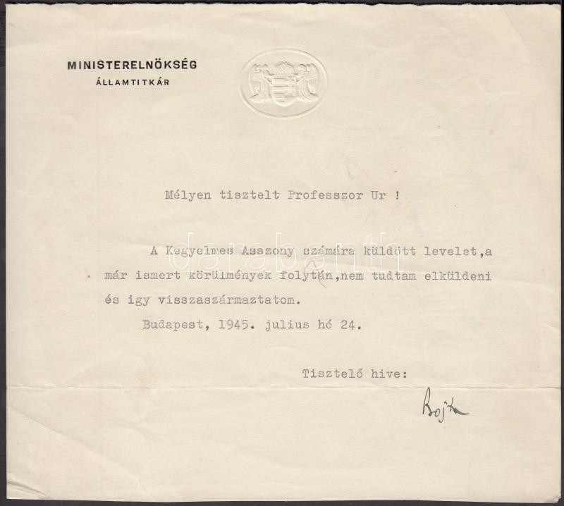 Leírás: 1945 Bp., Bojta Ernő Béla (1899-1969) magyar miniszterelnökségi államtitkár aláírása levélen