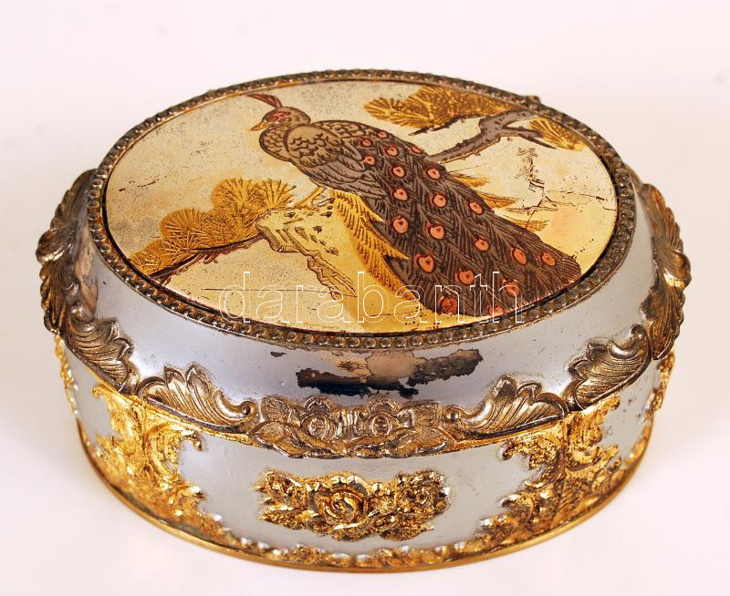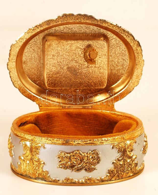 Leírás: Arany-ezüst színű, ovális alakú japán zenélő doboz, működőképes állapotban, 9x7x4 cm