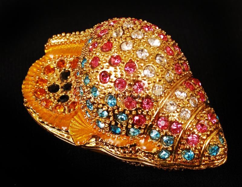 Leírás: Belül gyöngyház berakásos, kívül strasszokkal díszített csiga alakú gyűrűtartó, 6x3 cm