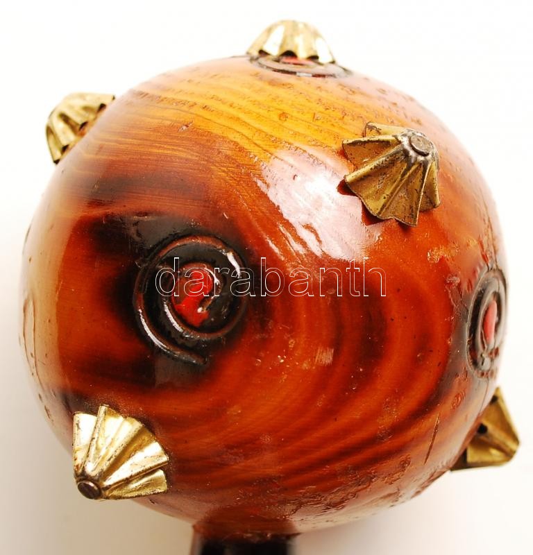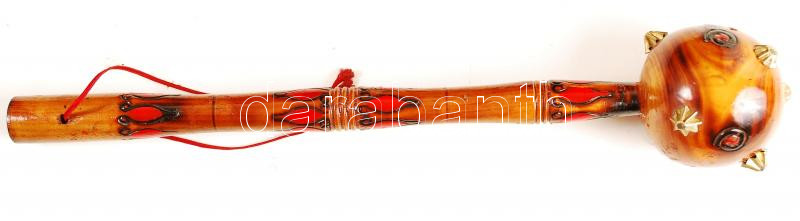 Leírás: Piros mintával díszített fa buzogány, h: 34 cm