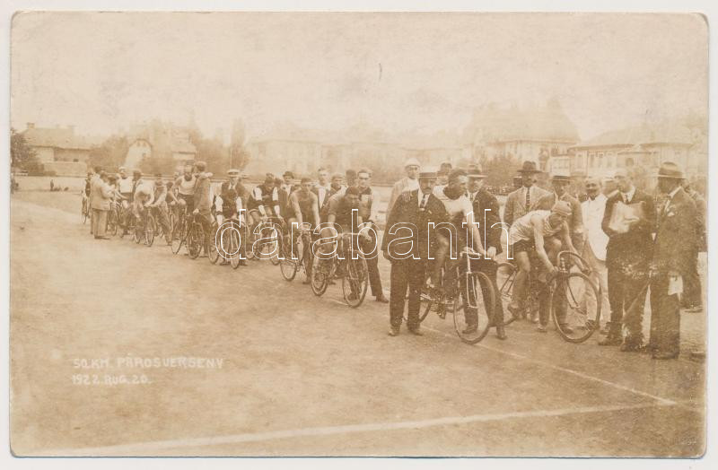 1922 Az 50 km-es páros kerékpár verseny résztvevői és az edzők, fotóla... https://www.darabanth.com/hu/218-Gyorsarveres/218.0/Festmeny-mutargy-papirregiseg-egyeb/Foto~200005/1922-Az-50-km-es-paros-kerekpar-verseny-resztvevoi-es-az-edzok-fotolap-9x14-cm~II925421