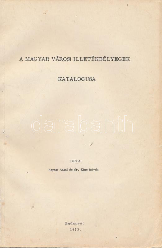 Leírás: Kaptai Antal - dr. Kiss István: A magyar városi illetékbélyegek katalógusa (Budapest, 1973)