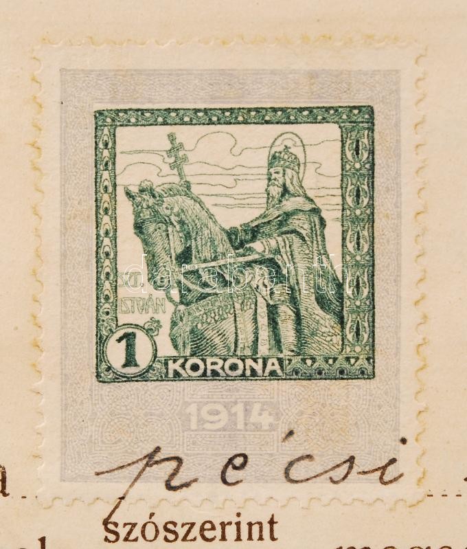 Leírás: 1908 Pécs városi illetékbélyeg 1K 1915-ös évi teljes iraton