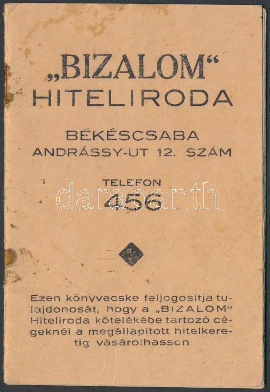 1934 A békéscsabai "Bizalom" Hiteliroda díjkönyve 70 pengő értékben. https://www.darabanth.com/hu/218-Gyorsarveres/218.0/Festmeny-mutargy-papirregiseg-egyeb/Okmanyok~200027/1934-A-bekescsabai-Bizalom-Hiteliroda-dijkonyve-70-pengo-ertekben~II925636