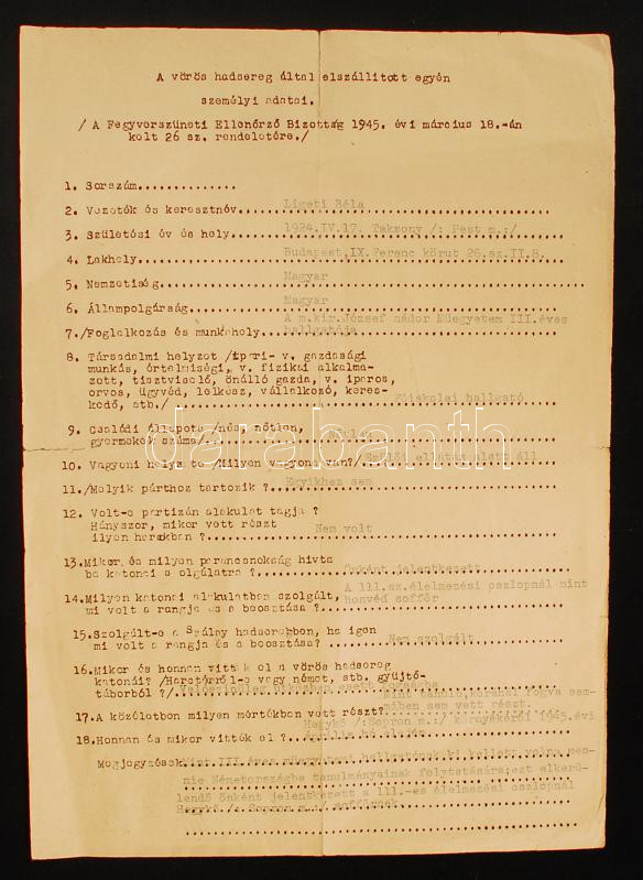 1945 Egy, a Vörös Hadsereg által elszállított egyén adatairól szóló ok... https://www.darabanth.com/hu/218-Gyorsarveres/218.0/Festmeny-mutargy-papirregiseg-egyeb/Okmanyok~200027/1945-Egy-a-Voros-Hadsereg-altal-elszallitott-egyen-adatairol-szolo-okmany~II927497