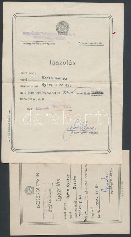 1949-1950 1-1 db béke- illetve tervkölcsön igazolás 350 és 300 forintn... https://www.darabanth.com/hu/218-Gyorsarveres/218.0/Festmeny-mutargy-papirregiseg-egyeb/Okmanyok~200027/1949-1950-1-1-db-beke-illetve-tervkolcson-igazolas-350-es-300-forintnyi-osszegrol~II925611